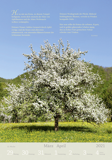 Hier versammelt sich auf den jeweils 53 Wochenblättern in Lyrik und Prosa die literarische und philosophische Welt von Arthur Schopenhauer bis Christian Morgenstern, Adalbert Stifter bis Conrad Ferdinand Meier, William Wordsworth und Rainer Maria Rilke. Joachim Ringelnatz meldet sich ebenso zu Wort wie Elizabeth Stroud, Rosamunde Pilcher, Kurt Tucholsky, Emily Dickinson, Friederike Mayröcker und John von Drüffel, und wir begegnen neben vielen andern auch Marcus Tullius Cicero, Gaius Petronius Arbiter, Sappho, Hugo Ball, Walter Gropius, Johann Wolfgang von Goethe, Wilhelm von Humboldt und Eduard Mörike.