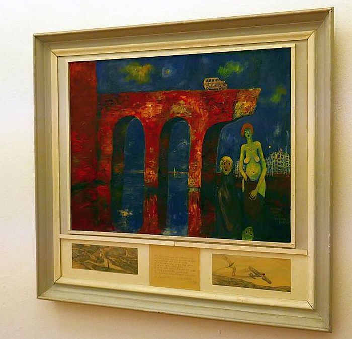Roger Loewig hat vor allem gezeichnet. Es gibt nur wenige farbige Ölbilder aus seiner frühen Zeit. Das Bild mit dem Titel der Solinger Ausstellung „Noch tönt Gesang unter der zerstörten Brücke“ (1962, 60x80 cm, Öl auf Hartfaser) gehört dazu. Zwei hohe Brückenbogen in Rot stützen die von links hinter einem Gebäude herkommende hohe Steinbrücke. Sie endet rechts frei, da der 3. Bogen zerstört ist. Oben sieht man ein Auto, welches, führe es wenige Meter weiter, über die hellere Bruchkante des 3. Bogens abstürzen würde. Im dunkelblauen Wasser spiegeln sich helle Wolken des Himmels und der weißliche Mond. Durch die Brückenbogen hindurch sieht man in der Ferne ein Segelboot und rechts am Bildrand helle Hochhäuser. Im Vordergrund rechts stehen 2 Frauen, deren kleinere in einen dunklen Mantel gehüllt, weißhaarig mit großen Augen nach vorne aus dem Bild herausschaut und singt. Die große rothaarige Frau neben ihr versucht bei nacktem Oberkörper mit ihrem Gewand Beine und teilweise Becken zu bedecken. Kopf und Oberkörper spiegeln sich unbestimmt im nächtlich-dunklen Wasser. Auch sie singt. Das Bild weist grundsätzliche Züge Loewigscher Bildgebung auf: Gegenständlich erscheinen Brücke, Auto und Sängerinnen, aber die Situation alles andere als realistisch. Auf anderen Bildern sieht man fantastische entmaterialisierte Skelettgestalten, pflanzlich deformierte Gesichter, mit Leben erfüllte Weiden, deren Äste wie Finger über Ödland im Wind sich bewegen. Man sieht aufgespießte Köpfe, Geschöpfe der Angst, nackte Leiber und Genitalien mehr oder wenig offen dargestellt in karger Landschaft liegen. Obwohl gelegentlich formal an Salvador Dali erinnernd, hat seine Malerei mit dem Surrealismus als Kunstepoche wenig zu tun. Die Hintergründigkeit der Loewigschen Bilder richtet sich auf seine biografische Erfahrung, nach der die surreale Welt der Alpträume und Absurditäten bei Loewig im 20. Jahrhundert Realität geworden sind. Mit feinem, elegantem Strich zeichnete er seine Welt auf ausgespanntem Papier, fast immer mit blassem Sonnenball am Himmel, aus dem sich schwarze Vögel und Flugapparate stürzen.