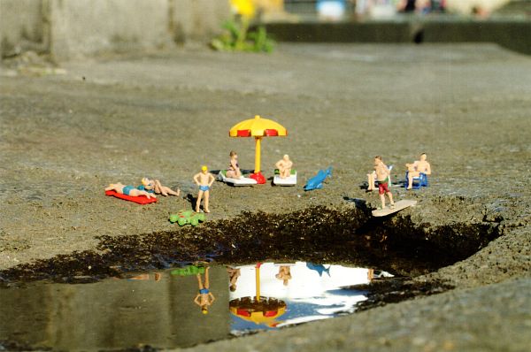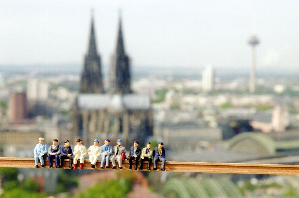 Tja, nun waren sie fort und kamen auch nie wieder. Also fast. Denn der in Bergheim bei Köln lebende Fotograf Bernd Schloemer gibt ihnen eine neue Plattform, ein neues, freies Leben, natürlich wieder in Köln, wo sie hingehören. Er inszeniert knapp 2 cm große Modellbaufigürchen in Alltagsszenen, die er in die reale „große“ Welt stellt.