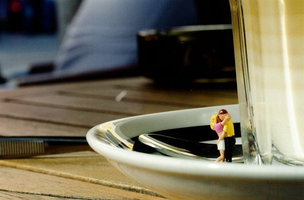 Da versucht sich ein solcher Winzling als Helfer beim Golf, indem er den knapp vor dem Hole gestoppten Ball ein Stückchen weiterschiebt. Ein Pärchen küßt sich – wo sonst? – auf einem Liebesschloß an der Deutzer Brücke, ein anderes auf der Untertasse eines Latte Macchiato.