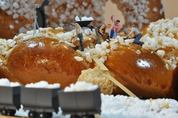 Sogar ein berühmtes Foto findet hier seine Fortsetzung: „Lunch atop a Skyscraper“, 1932 in der New York Herald Tribune erschienen, geht auch mit dem Kölner Dom im Hintergrund (siehe oben). Und weil das Leben so süß ist, arbeitet Bernd Schloemer, bzw. seine colognies tun es, auch gerne mit Zucker - hier wird er von einer Mannschaft in die Kaffeetasse gehievt, dort arbeiten wackere „Linien“-Schützer daran, ihn am Gebäck zu reduzieren und anderswo dient er als Rodel-Piste oder Berg zum Besteigen.