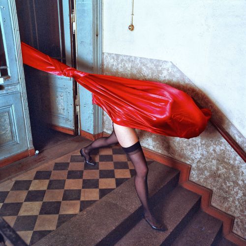 Was Olaf Martens (*1963) in der DDR während seines Studiums an der Hochschule für Grafik und Buchkunst Leipzig und in den Jahren danach bis in die Nach-Wende-Zeit auf die Platte bannte, fiel zu diesen sozialistisch muffigen Zeiten völlig aus dem Rahmen. Experimentelle, provokante Akt-Fotografie, die nicht nur durch die Wahl von Ort, Modellen und Ausstattung in eine neue Richtung ging, die auch durch den bewußten Verzicht auf adäquate Ausleuchtung und herkömmliche Ästhetik auf sich aufmerksam machte. In Bild-Perspektive, Licht, Einsatz von (auch mal rutschenden) Strümpfen, Strapsen, Miedern, Schuhen, Fetisch-Accessoires und Fernsehgeräten an ungewohnten Orten, in Abbruchhäusern, Kellern und auf Dächern der verfallenden DDR, die heute teils als „Lost Places“ bezeichnet werden, schuf Martens seine teils ungemein witzigen, oft aber auch kryptischen Tableaus. Auch der Einsatz von Farbfotografie unterschied ihn von seinen Kollegen in der DDR, die überwiegend und erfolgreich auf ästhetische schwarz/weiß-Fotografie setzten.