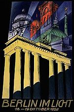 Das Märkische Museum hat für diese Ausstellung seine Schatzkammern geöffnet: es sind z.B. wunderschöne auf elektrisches Licht umgerüstete Kristall-Lüster zu sehen, fast schamhaft schlängeln sich dünne Kabel an den Streben der Kronleuchter entlang. Ein Modell des großen Schauspielhauses von Hans Poelzig zieht die Blicke an, Gemälde nächtlicher Straßenszenen von Lesser Ury, Lyonel Feiniger und Hans Baluschek sind zu bewundern, Plakate von Amüsieretablissements und Aufrufe zur Verdunkelung geben Einblick in vergangene Gegenwart, und last not least beeindrucken Fotos aus Firmenarchiven z.B. aus dem der AEG. Die Speer- und die Paulick-Leuchte sind in Originalgröße ausgestellt. Verwundert reibt man sich die Augen, könnte es sein, daß die beiden nach konträren ideologischen Prinzipien konzipierten Straßenlampen eine gewisse Ähnlichkeit haben?