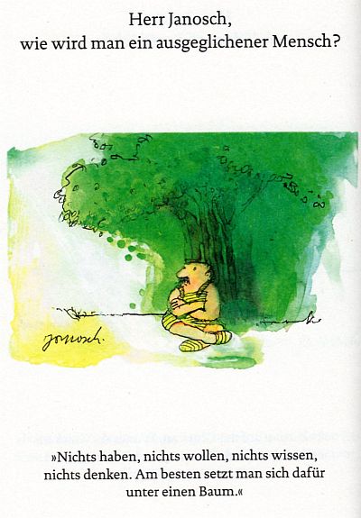 Weil Janosch am 11. März 90 Jahre alt wird, hat der Reclam Verlag eine Auswahl von 98 Fragen/Antworten zusammengestellt, die er im beliebten broschierten gelben Duodez-Format der Universal-Bibliothek pünktlich zum Geburtstag des Jubilars vorlegt. Es ist eine humorvolle, altersweise und durchaus beherzigenswerte Melange aus Konfuzius und Radio Eriwan, genau richtig für die Jackentasche und sooo klug! Nehmen wir nur das hier: Herr Janosch, schwere Entscheidungen, wie trifft man die? – „Man schreibt die Alternativen tabellarisch auf einen Zettel. Anschließend legt man den Zettel nieder und wirft einen Löffel aif den Zettel. Dann geht man weg und läßt den Löffel das regeln. Sein Problem.“ Oder das: Herr Janosch, wie hält man das Glück fest? – „Es kommt auf das Glück an. Wondraks Glück ist ein kleiner Hund. Den muß er nicht festhalten. Eine Wurst genügt.“ (Janosch muß unseren Freund Erwin Grosche kennen.) Ein anderes Beispiel zeige ich ihnen im Bild: