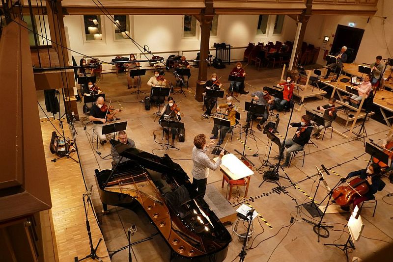 Der erste Aufnahmetermin im Januar 2021 reichte wegen Coronaeinschränkungen nur für die Klavierkonzerte 1-3. Die Immanuelskirche mit ihrer auch ohne Publikum legendären Akustik erwies sich für dieses Projekt als sehr gut geeignet. Der große Saal der Stadthalle neigt dagegen ohne Publikum zu Überakustik. Bei zunehmenden Infektionszahlen lag das Projekt nach dem Abbruch der Aufnahmen dann erst einmal auf Eis. Am 14. März aber galt dem RKI (Robert Koch Institut) Portugal plötzlich nicht mehr als Virusvariantengebiet, sodaß für den Pianisten die Reisebeschränkungen plötzlich und unerwartet wegfielen. Sofort liefen die Telefone heiß: Immanuelskirche, Flugkarten für den Pianisten (aus Portugal) wie für den Klavierstimmer aus Berlin wurden gebucht und der Toningenieur alarmiert. Das Orchester war bereits schon in der Woche zuvor wegen Aufnahmen für ein Streaming-Sinfoniekonzert aus der Kurzarbeit geholt worden. Also konnte am 21.03.21 die erste Probe unter den ausgeklügelten Bedingungen der aktuellen Coronaschutzverordnung stattfinden, die anders wo schon seit langem vieles möglich gemacht hat. In Berlin haben die Philharmoniker kürzlich gar ein Präsenzkonzert ermöglicht. Zu den Proben hier werden alle Bläser, die Dirigentin und der Solist alle 48 Stunden getestet. Neun erste, sechs zweite Geigen, vier Violoncelli und 4 Bratschen, zwei Kontrabässe sitzen unter den zahlreichen Aufnahmemikrophonen auf gehörigem 2m Abstand immer mit Mund-Nasenschutz, dahinter Holz- und Blechbläser ohne wie auch Dirigentin und Solist. Und ganz hinten thront der Schlagzeuger über seinen Barockpauken vor rotem Tuch, welches „vom Himmel“ herabhängt. Wie immer hat er alles im Blick. Georg Kreislers Erotik der Instrumente will sich hier noch nicht recht einstellen. Der Solist fingert sich auf dem Flügel ein, die Musikerinnen und Musiker auf ihren Instrumenten: noch keine Musik aber klangvolles, produktives Chaos. Schließlich bittet Konzertmeister Nikolai Mintchev mit fast drohend erhobenem Bogen um Ruhe bzw. zum Stimmen. Da erscheint die Generalmusikdirektorin Julia Jones, kündigt an „Bitte 4. Klavierkonzert, 3 Satz“, hebt den Stab und beginnt. Nach wenigen Takten bricht sie schon wieder ab, möchte die Phrase von den Violinen noch lebhafter, organischer hören, bittet darum mit ausgebreiteten Armen und tiefer Verbeugung. Beim 3. Durchgang ist sie endlich zufrieden. Subtil spürt sie der Atmung und Agogik des Solisten nach und vermittelt mit Händen, Armen und Stab dem Orchester den musikalischen Fluß dieses Rondos, diskutiert mit den Bratschen, die als Mittelstimme untergehen könnten. Plötzlich läuft der Konzertmeister hinaus: „Es zieht wie Hechtsuppe. Ich wollte nur schauen ob die Türen geschlossen sind“ erklärt er der überraschten Dirigentin. Höchst konzentriert wird in der nächsten Stunde der ganze Satz nahezu Takt für Takt durchgearbeitet. Die Kommunikation gelingt trotz des ungewohnten Abstands und aus den Augen des Pianisten funkeln Zufriedenheit und Humor. Bei dieser ersten Probe nimmt der Tonmeister - er sitzt außerhalb des Kirchsaales in der ehemaligen Sakristei“ – noch nicht systematisch auf, sondern testet seine Mischpulte und regelt die Mikrophone ein. In dieser Weise wird zweimal drei Stunden pro Tag, fünf Tage lang geprobt. Auf die Aufnahme wird der Tonmeister darüber hinaus Einfluß nehmen und auch von sich aus über die Lautsprecherverbindung zum Saal unterbrechen, um eine Passage gegebenenfalls erneut aufzunehmen. Seinen Ohren entgeht nichts. Aus den sogenannten Tracks, von denen es zahlreiche -vermutlich mehr als hundert - geben wird, kann er endlich die Musik so zusammenschneiden, wie sie auf der CD zu hören sein wird. Ihr Genuß im Wohnzimmer ist also mit dem sinnlichen Konzerterlebnis im Saal nicht zu vergleichen. So eine Orchesterprobe hat ihre ganz eigene Atmosphäre. Mit Kritik, Selbstkritik, gegenseitigem Respekt folgen die ca. 50 Musiker hochmotiviert den musikalischen Vorstellungen und setzen sie um. Vielleicht gibt es in der Zusammenarbeit zwischen Dirigenten und Orchester in den letzten 100 Jahren tatsächlich Fortschritte, und die Toscaninis sterben aus. Sie haben als machtbesessene Tyrannen und Imperatoren des Taktstocks - Gendersternchen fällt hier wirklich weg - geglaubt, nur Macht, Hohn und Demütigung trieben ein Orchester zu Höchstleistungen an.