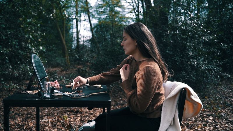 Marie Sojer kann wegen Corona nicht im Opernhaus vor Publikum auftreten. Also sucht sie ihr Publikum auf und geht auf dem Nützenberg im noch sehr vorfrühlingshaft anmutenden Wald bei grauem Wetter spazieren. Man hätte sie dort treffen können. Kurz eingeblendete Schminkutensilien überraschen und wecken Neugier. Die Mezzosopranistin beginnt eine anrührende Arie und findet einen Schminktisch, an dem sie sich zurechtmacht, als ihr Blick auf ein wunderbares Kostüm aus der Barockzeit fällt, welches wie in einem Märchen auf einem nahen Busch hängt. Plötzlich hat sie dieses Kleid an, geht mit nackten Füßen auf dem Waldboden umher, kommt zurück an den Tisch, prüft im Spiegel ihr Aussehen, inzwischen scheint sogar die Sonne. Dazu singt sie mit Cembalobegleitung Purcells „Music for a while“, eine Arie über ostinatem, also sich ständig wiederholendem Baß und schlendert durch den Wald auf der Kaiserhöhe. Die jeweils nur leicht modifizierte Begleitung bietet dem tröstlich frei schwingendem Mezzosopran stets musikalischen Halt. Die Musik entstand als Schauspielmusik zu „Oedipus“ (von John Dryden und Nathaniel Lee nach Sophokles), aus welchem Schauspiel auch der Text der Arie stammt, der der Kraft der Musik huldigt.