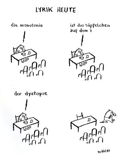 Man liest auch, daß das Satiremagazin bis zur 1000. Ausgabe weiter macht (oder bis kein anderes Magazin mehr am deutschen Markt erscheint). Wir können ´s kaum erwarten. Uns hat übrigens dieser Beitrag von Nicolas Mahler am besten gefallen: