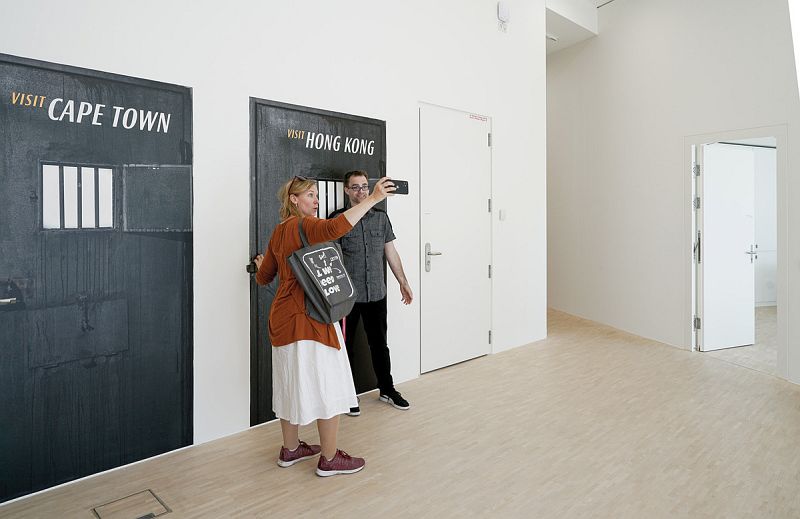 Ein halbes Dutzend Installationen lädt zu einem Parcours ein, der die Betrachter zu einem aktiven Teil der Ausstellung werden läßt. Die Installationen bieten die Möglichkeit, via Selfie eine Reise um die Welt anzutreten. Dieser Streifzug führt allerdings an die Abgründe des Tourismus und zu den Verwüstungen, die durch das kollektive Reisen verursacht werden. Großwildjagden und Massendestinationen wie das Parthenon in Athen oder ein Strand auf der spanischen Party-Insel Mallorca führen uns dabei in die Grenzgebiete der kulturellen Aneignung und lassen einen ambivalenten Heimatbegriff entstehen. Das obligatorische Selfie-Lachen gerät zu einer Karikatur seiner selbst: Jegliche Distanz ist verloren und die Besucher werden selbst zum Teil des skurrilen Bildgeschehens. Rote Kreuze markieren dabei die idealen Selfie-Standpunkte. Mittels Hashtag – „#TheCliffhangerCollection“ – können die Selfies, die vor Ort entstehen, direkt ins Netz gestellt werden. Der Instagram-Feed zum Hashtag ist auf einem Screen in der Ausstellung abrufbar.