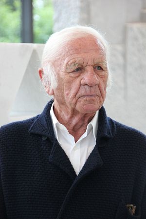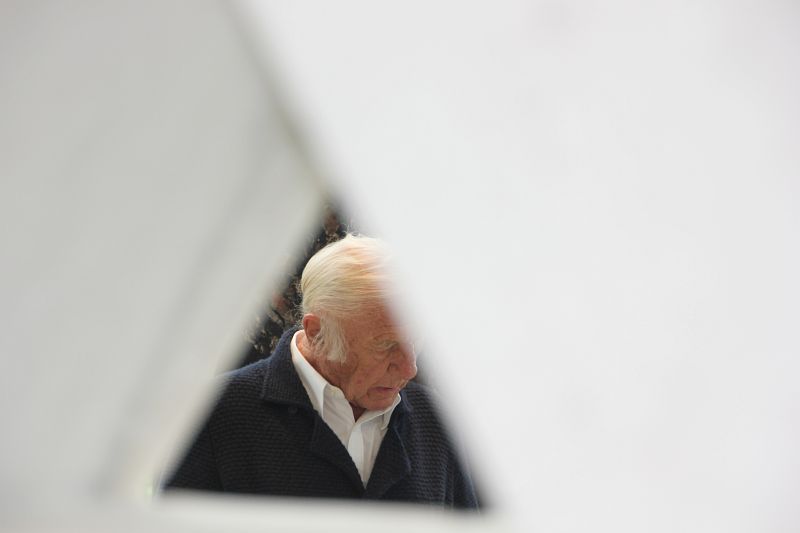Am Fuße des bewaldeten Unterbarmer Musenhügels steht der Neunzigjährige in langem schwarzem Mantel, wartend auf die Fahrt außen herum zur oberen Halle des Skulpturenparks Waldfrieden. Fast 400 Ausstellungen hatte Heinz Mack in den letzten 70 Jahren. Gerade ging die große Ausstellung im Kunstpalast Düsseldorf zu Ende.
