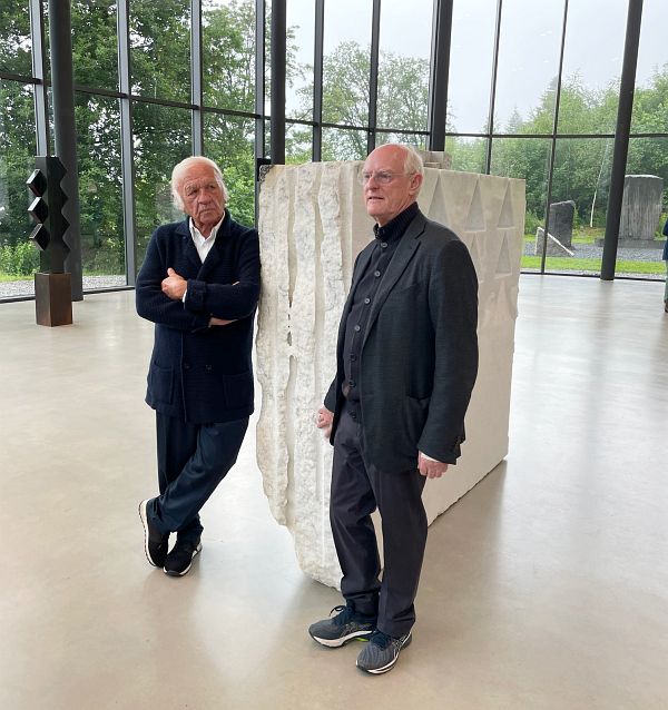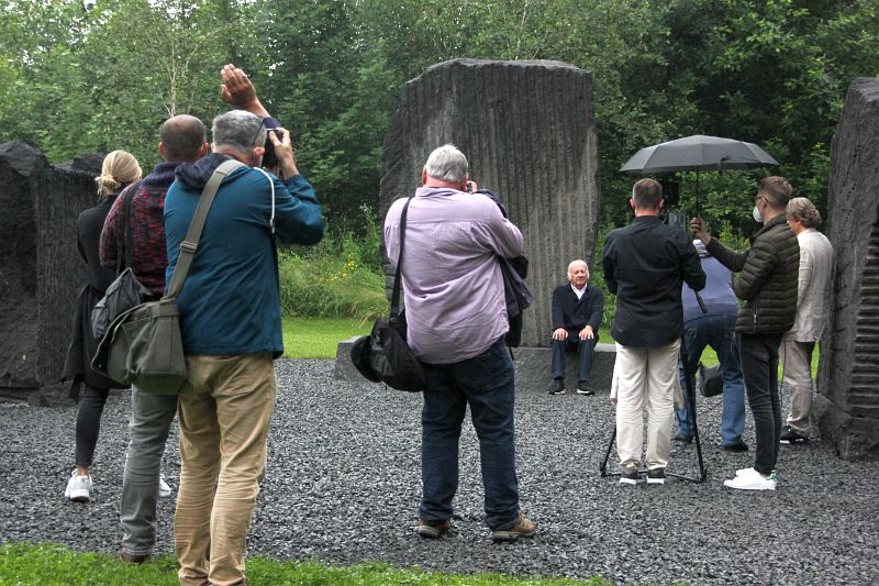 All wir anderen wandelten bei leichtem Nieselregen durch den Wald hinauf. Unter den hohen Buchen, auf denen der Bussard nistet, kommen seine vier hohen, dunklen Granitstelen mythisch ins Bild (Vier Stein-Stelen, 1995). Weiter oben sind auf einem Hektar rund 80 Fichten der Trockenheit bzw. dem Borkenkäfer zum Opfer gefallen. Inzwischen ist das Areal eingesät und am Rand mit neuen Bäumen und Büschen bepflanzt, die der Trockenheit und dem Ungeziefer (hoffentlich) besser widerstehen. Auf der Freiheit dieser Lichtung ragen die beiden golden gezackten Stelen „Zwischen Himmel und Erde“ (2011) und „Großer Rhythmus“ in die Höhe. Vor der oberen Halle fällt unser Blick zunächst auf den „Großen Stufenmonolith“ (1989) auf weißem Kies vor dem dunklen Wald, bevor wir eintreten. Hier sind etliche Marmorskulpturen des 90jährigen Bildhauers ausgestellt. An „Die Wand“ aus weiß-schwarz marmoriertem Marmor mit ihren dreieckigen Durchbrüchen lehnen sich Gastgeber und Künstler für die Meute der Fotografen, bevor sie miteinander im Wechselgespräch Gedanken austauschen.