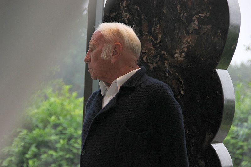 „Ich bin glücklich, daß wir uns, nachdem Tony Cragg mich vor einiger Zeit aufgesucht hat, sofort gut verstanden haben“. Als Künstler allerdings sei er Einzelgänger und vollkommen alleine, wie in der Wüste. Und es sei durchaus eine „kollegiale und sensible“ Aufgabe gewesen, aus seinem riesigen Gesamtwerk für diese Ausstellung eine Auswahl zu treffen. Sehr dankbar sei er für diese Ausstellung, in der zum ersten Mal in solcher Fülle seine Skulpturen gezeigt werden und das in dieser herrlichen Umgebung. Der Skulpturenpark von Tony Cragg sei in seiner Größe, seinem Flair einzigartig in Deutschland. Aber in den USA und in England gebe es etliche, teilweise sehr viel größere Skulpturenparks. In diesen Ländern spiele die Skulptur auch eine viel bedeutendere Rolle als bei uns in Deutschland. Hier sei Mäzenatentum und Sponsoring lange nicht so populär und ausgeprägt wie anderswo, wobei er die schreckliche Diskussion über Geld, Schwarzgeld, Kunst und Großsponsoren, wie sie aktuell das MOMA (New York) und den Louvre erschüttert, außen vorließ und lieber über seine Werke sprach. Die monumentalen Skulpturen hinter der oberen Halle (u.a. „Großer Epitaph“, 2011), seien in einem Steinbruch der Vulkaneifel entstanden. Tony Cragg hat etliche der hier ausgestellten Skulpturen in seinem Garten in Mönchengladbach entdeckt. Er weist auf die im Werk Heinz Macks vorherrschende Stele hin, die schon seit der Steinzeit in der Kunst eine Rolle spiele. Heinz Mack schätzt besonders den Wald des Skulpturenparks. Zu hohem Buchenwald habe er seit seiner Kindheit eine besondere Beziehung. Als Kind und habe er schon mit der Leica seines Onkels in den Wäldern und Vulkanbergen bei Lollar (nahe Gießen) Felsbrocken und Steine fotografiert. Wenn er als Kunststudent in Düsseldorf bei Ewald Mataré eines gelernt habe, dann die Idee von „der Sprache des Materials“. Seine erste Skulptur sei aus einem Brett entstanden, welches er auf einer Straßenbaustelle bekommen konnte. Bezüglich der verwendeten Materialien ist er nicht festgelegt.