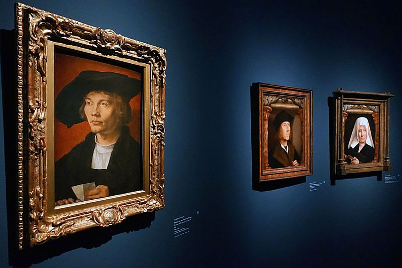 Fern der eigenen Werkstatt entstanden aber auch einige herausragende Ölgemälde, so etwa das Bildnis des Bernhard von Reesen, ein damals dreißigjähriger Hansekaufmanns aus Danzig (Gemäldegalerie Dresden). Dieses relativ kleinformatige Halbfigurenporträt im Dreiviertelprofil mit neutralem Hintergrund entspricht einem Bildtypus, der sich ungefähr zeitgleich auch bei einem flämischen Maler wie Quinten Massys findet, was in einem der schön gestalteten Schauräume durch eine direkte Bildgegenüberstellung spontan erfahrbar wird. Zu den Höhepunkten der Ausstellung gehört als Leihgabe aus Lissabon zweifellos Dürers eindrucksvolles Ölbild „Der hl. Hieronymus im Studierzimmer“. Es ist überliefert, daß für den greisen Kirchenvater ein dreiundneunzigjähriger alter Mann Modell gesessen habe, den Dürer mit äußerster Präzision und einem kaum zu überbietenden Realismus auf die Bildfläche gebannt hat. Melancholisch stützt der bärtige Heilige seinen Kopf auf die Hand und deutet zugleich auf einen Totenschädel, so daß diese Inszenierung umstandslos als Memento mori zu lesen ist. Wie sehr dieses Gemälde niederländische Künstler zu ähnlichen Bildern inspiriert hat, zeigen die Kuratoren der Ausstellung anhand ausgewählter Arbeiten von Lucas van Leyden, Joos van Cleve und anderen.
