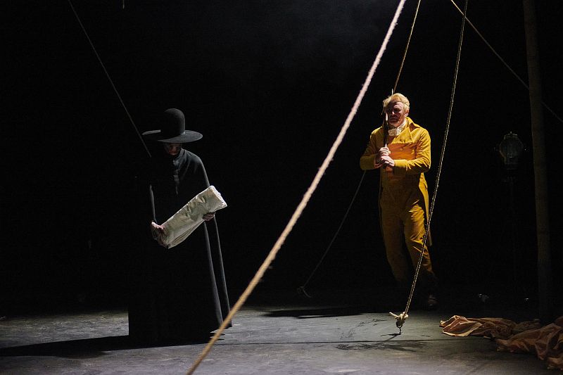 Der Abend packt und überzeugt dabei auch ästhetisch. Letzteres meint nicht zuletzt das Bühnenbild von Christian Blechschmidt, das den Zuschauer empfängt, anfangs still und würdig: Fast bis zur Decke ragt weiße Leinwand, Masten mit Tüchern, wie Vorhänge, die aber auch Segeln ähneln könnten: Sollen sie fragen, wohin die „Reise“ geht? Richtungsfragen sind es ja jedenfalls entschieden, die Büchner stellt und wohl auch beantwortet in seinem Drama: Die Hüter der reinen Lehre driften zur Schreckensherrschaft, der auch Danton, der Mahner zur Mäßigung, letztlich zum Opfer fällt.
