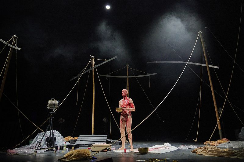 Alles kulminiert kraß und komplett spaßfrei in St. Just. Die historische Gestalt betrieb wesentlich Dantons Hinrichtung. Nach Robespierres immerhin idealistischem Start zeigt in Frickes Inszenierung hier der Fanatismus sein grausiges Gesicht. Beängstigend das erst stumme Spiel Thomas Braus', der sich ritzt, blutig windet und buchstäblich häutet - und dann so absurd wie unbeirrt dabei doziert: Seine Litanei der Totenzahlen von Kriegen und Krisen führt ihn zu finalen, in sich erschreckend stimmigen Schlüssen: Kaltes, lebloses Denken in Perversion.
