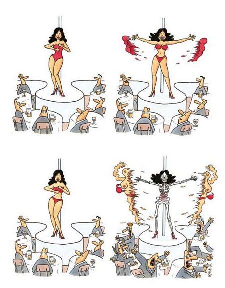 Es ist ein Cartoonbuch, doch hat Ottitsch sich bekanntlich ja auch auf dem Gebiet des Comics einen Namen gemacht, also hat er dieses Cartoonbuch auch mit Comics – natürlich ebenso bösen gefüllt.