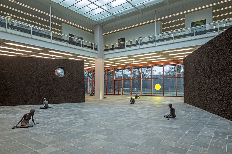 Einem intimen Vorspann zur Ausstellung gleich stehen am Anfang sechzig gerahmte Papierarbeiten aus der Serie „poems“, die Rondinone 2003 begonnen hat und seit 2020 weiterführt. Auf diesen Auftakt folgt eine monumentale Setzung: „two standing landscapes with sunrise and sunset“ (2021) titelt die überdimensionale zweiteilige Arbeit, die Rondinone eigens für diese Ausstellung geschaffen hat. Diese über vier Meter hohen, 16 beziehungsweise 18 Meter breiten und mehrere Tonnen schweren „Wände“ sind sowohl als Bilder als auch als Skulpturen lesbar. Zwei in unterschiedlicher Höhe plazierte kreisrunde Ausschnitte markieren dabei einen Sonnenaufgang und einen Sonnenuntergang.