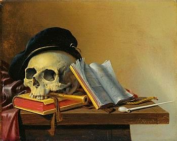 Einige beeindruckende Bilder zeigen den aller menschlichen Identität beraubten Schädel, so wie wir ihn vor dem Auge haben, denken wir an Shakespeares Prinzen Hamlet im berühmten Monolog "Sein oder nicht sein": Sebastian Stoskopff (1597-1657) hat ihm ebenso wie seine Malerkollegen die erlöschende Flamme der Kerze oder des Dochts beigegeben, Harmen Steenwyck (1612-1656)setzt ihm gar eine Mütze auf.