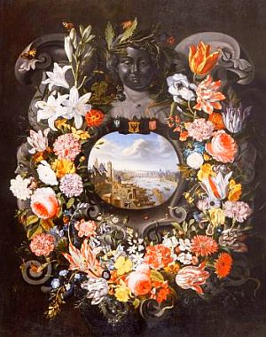 des täglichen Gebrauchs und Küchengerätschaften ergänzt, bilden das vielleicht farbenprächtigste Kapitel. Die Kartuschen- und Nischenbilder - Magdalena Kraemer-Noble hat sich mit diesem Thema beschäftigt - von Meistern aus den Niederlanden, der Schweiz, Deutschland und Italien überwältigen den Schauenden. Lilien, Rosen, Tulpen und Nelken in einer Pracht, wie man sie heute nicht mehr kennt, Gerbera und Weintrauben, kostbare Südfrüchte, auch einmal ein Hummer, eine Melone oder kostbares Porzellan dazu, protzen mit der Fülle der Natur. Abraham Mignon (s.o.) wird vielfach zitiert, er gehört zu den Sinnesfreudigsten der Sinnesfrohen Maler seiner Zeit. Pieter de Ring (1615-1660), Cornelis de Heem (1631-1695), Jan Davidsz de Heem (1606-1683) und Joris van Son (1623-1667) lassen uns mitschwelgen. Bei Jacob Marrel (1613-1681), Johann Rudolf Bys (1662-1738) und Abraham Mignon fonden wir verschwenderische ausgestaltete Beispiele für das Umrahmen eines Landschaftsbildes in einer Nische/Kartusche mit prächtig arrangierten Blumen- und Früchte-Gebinden in dreidimensionaler Darstellung. Ein herausragendes, wiederum die Grenzen des Genres sprengendes Bild ist Jan Brueghels d.Ä./Peter Paul Rubens´ "Allegorie des Sehens" (1617), welches eine umfassende Darstellung der bildenden Kunst transportiert.
