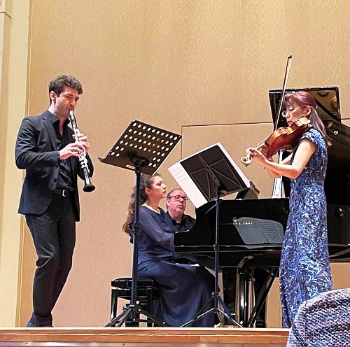 Nach der Pause gab es das Klaviertrio für Klarinette, Bratsche und Klavier in Es-Dur von Gustav Jenner (1865-1929), der, obwohl in Keitum geboren und einziger Schüler von Johannes Brahms, selbst auf Sylt weniger bekannt ist als die Fischbude Goschs. Dabei wurde er von Tschaikowski entdeckt und von Theodor Storm hochgeschätzt. Sein Trio war ursprünglich für Klarinette, Horn und Klavier geschrieben worden. Bei warmem dunklem Klang von Klarinette und Bratsche zwischen im Diskant perlender Klavierromantik darüber und sonorem Baß darunter, bleibt der Einfluß des berühmten Lehrers bei aber durchaus eigener Musiksprache immer präsent. Souverän, melodisch schwelgend mit fein nuancierter Dynamik und ausdrucksvoller Agogik breiteten im Adagio des 2. Satz (Adagio) nach rezitativischen Klaviervorspiel Klarinette und Bratsche ihre Themen aus. Das motorisch losjagende Presto des 3. Satzes in Schumannscher Manier endet überraschend nach ff-Schlag mit Pizzicato Akkord im PP. Nach dem großen Allegro ma non troppo des Schlußsatzes bedankte sich das Publikum mit starkem Applaus für diese tatsächlich ungewöhnlichen musikalischen Wahlverwandtschaften zwischen Brahms und Jenner bzw. zwischen Bratsche und Klarinette.