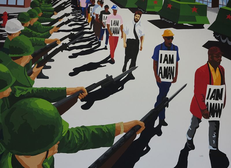 Aus Sicht der südlichen Erdkugel wurde der nördlichen, speziell aber den Europäern der Spiegel vorgehalten. Krieg, Flucht, Vertreibung, Unterdrückung, Erniedrigung, Landraub und Verächtlichmachung angeblich minderwertiger Ethnien waren die überwiegenden Themen. Vieles war eindringlich, nachdenkenswert und für uns „Weiße“ beschämend. Das war für eine Weltkunstausstellung zuviel, oder zu wenig, je nach Betrachtung. Wie gesagt, mir fehlte die ästhetisch ansprechende Kunst. Ich gebe zu, das ist nicht ganz gerecht. Einiges Ansprechendes gab es doch zu sehen, denn die Ungerechtigkeiten der Welt lassen sich auch mit Mitteln der Kunst darstellen. Hier einige Beispiele: