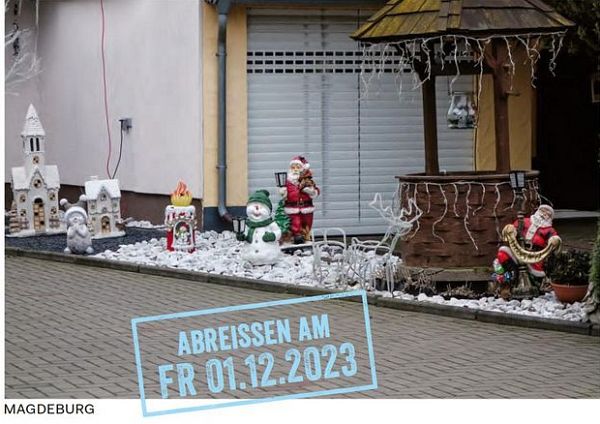 „Individualisierte Reihenhäuser, die um jeden Preis aus ebendieser Reihe tanzen wollen, Stadtrand-Villen mit Instant-Ambiente, abenteuerliche Motto- und Steingärten, die von fremden Welten und Kulturen künden, alles andere als einladende Einkaufszentren und überaus kontrastreiche Ladengestaltungen in den Innenstädten – Bausünden, soweit das Auge reicht …“, verspricht der Klappentext zu diesem höchst unterhaltsamen Kalender, der täglich einen Abriß fordert. Tun Sie mit, schwingen Sie die virtuelle Abrißbirne! Da kann man wirklich nichts falsch machen, ob es groteske Säulenvorbauten in Michendorf und Potsdam oder knallfarbige Fassaden allenthalben, Platten in Pforzheim, augenschmerzende Zaun-Kreationen, scheußliche Weihnachtsmann-Dekorationen im steinernen Vorgarten in Magdeburg (überhaupt: Steinvorgärten ohne Zahl) oder bunte Plastik-Pseudoblumen vor langweiliger Mauer in Regen trifft. Abreißen … aber sofort! Vorschlaghämmer gibt es in Ihrem örtlichen Baumarkt.