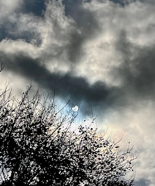 Mit einem seltsamen Gefühl schaute man die Sonne an, da an ihr nach wenigen Minuten so Merkwürdiges vorgehen sollte. Weit draußen, wo der große Strom geht, lag ein dicke, langgestreckte Nebellinie, auch im südöstlichen Horizonte krochen Nebel und Wolkenballen herum, die wir sehr fürchteten, und ganze Teile der Stadt schwammen in Dunst hinaus. An der Stelle der Sonne waren nur ganz schwache Schleier, und auch diese ließen große blaue Inseln durchblicken.