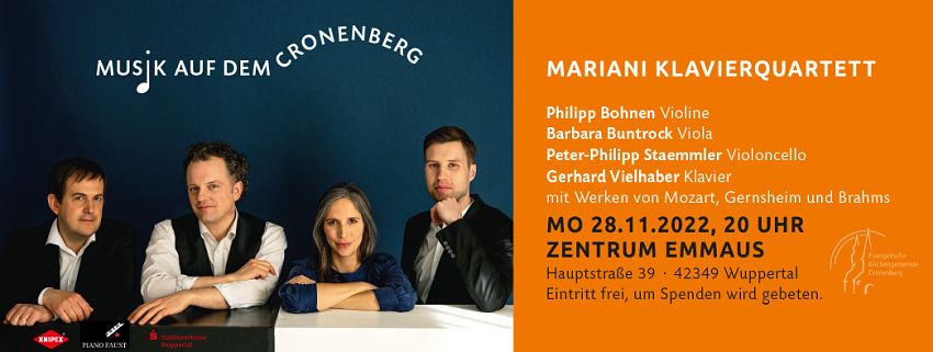 Am kommenden Montag, dem 28. November 2022 um 20 Uhr im Zentrum Emmaus (Hauptstr. 39 - 42349 Wuppertal), werde ich zusammen mit meinem Mariani Klavierquartett das nächste Konzert von Musik auf dem CronenBerg gestalten. Ich bin sehr froh, daß ich meine Kollegen Philipp Bohnen, Peter-Philipp Staemmler und Gerhard Vielhaber zu uns nach Cronenberg mitbringen kann, da dieses Ensemble für mich meine musikalische Heimat geworden ist. Wir spielen nun schon seit 13 Jahren in derselben Besetzung zusammen. Unser letztes Konzert bei Musik auf dem CronenBerg ist schon eine Weile her (2016) und nun kommen wir zurück; ein bißchen gereifter und um einige graue Haare reicher.