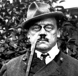 Er schiebt mit der Krücke seines Stockes das hemmende Papier weg und fragt in gemütlichem Tone: