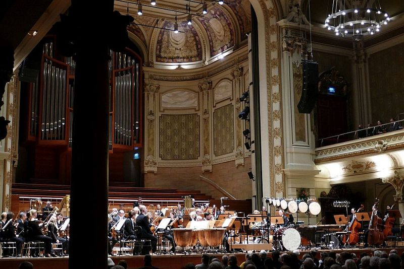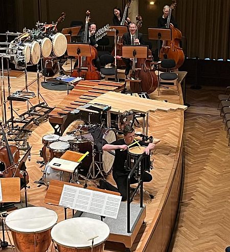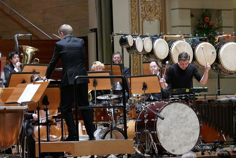 Zwar war die rechte Seite der Bühne schon zuvor weitgehend mit Schlagwerk besetzt (Marimba, Txalaparta (baskisches Aufschlagidiophon), sieben Taikotrommeln unterschiedlichster Größe, Weinflasche, Schlüsselbund, große Trommel, aufwendiges Glockenspiel und anderes mehr) und das Orchester nach links und hinten zusammen gedrängt. Zuletzt aber es wurden noch vier Pauken links vom Dirigenten zusätzlich gebraucht. Und dann entfaltete Martin Grubinger mit der deutschen Erstaufführung von Daniel Bjarnasons Percussionskonzert „Inferno“ einen Rhythmus-Sturm im Saal. Die Uraufführung erfolgte vor kurzem in Helsinki unter Leitung von Tomas Djupsjöbacka. Der isländische Komponist Bjarnason feiert nach seinem Musikstudium Reykjavík (Aufbaustudium in Freiburg) inzwischen weltweit Erfolg. 2019 wurde seine Auftragskomposition für das LA Phil von Gustavo Dudamel, Zubin Mehta und Esa-Pekka Salonen gemeinsam uraufgeführt. Mehrere Auftragskompositionen erhielt er auch vom Cincinnati Symphony Orchestra. Nach „The Wave“ von Keiko Abe 2017 (Elbtonal Percussions) und der unvergessenen Vivi Vassilieva (Uraufführung „Oraculum“ von Oriol Cruixent) in den letzten Jahren war man hier sehr gespannt auf das dem Solisten gewidmete Werk, der sich wie ein Spitzensportler vorbereitet mit Radfahren, Joggen, 8-10 Übungsstunden, kontrollierter Ernährung, usw. usw… Nur so fühlt er sich den Herausforderungen seiner Schlagzeugexzesse (Marathonkonzerte bis zu acht Stunden Dauer!) gewachsen. Heute endete „Inferno“ schon nach 33 Minuten. Im 1. Satz („The Bells“) stand die Marimba im Vordergrund. Die Klangfarbigkeit des Schlagzeugapparats ist frappierend. Das Orchester spiegelt gelegentlich kurze thematische Blöcke wider, zieht immer wieder lange melodischen Linien über das orchestral anmutende Schlagwerk, welches im PP von vogelartigen Einwürfen verfremdet wird. Im FF aber sausen die Trommelschlegel, stets mehrere in jeder Hand, aus hochgereckter Höhe auf das Schlagwerk hinab. Die ausgefuchste Agogik schien makellos und der Umfang der Dynamik war erstaunlich. Zum 2. Satz wurden Seiten und Instrumente gewechselt. Auf 4 Pauken breitete der Solist zusammen mit den beiden Schlagzeugern des Orchesters (Martin Schacht und Daniel Häker) zunächst leise Paukenstille und beunruhigende Pauken-Glissandi aus. Dabei wurden dank wechselnder Stimmungen kurze, nahezu melodiöse Themen ineinander verschränkt, bis das Ganze unter zunehmender Dynamik sich zu einem Paukeninferno entwickelt. Im letzten Satz (Dark Shores - Dunkle Ufer) stand das baskische Aufschlagidiophon im Mittelpunkt, Die über zwei Querträgern gelegenen Schlagbalken unterschiedlicher Tonhöhe schlägt Martin Grubinger mit zwei senkrecht oder waagerecht gehalten Schlagstöcken. Der zunächst ruhige „dunkle Strand“ belebt sich zunehmend. Orchester und Schlagwerk nehmen Fahrt auf bis zum rasenden Finale. Das Publikum war völlig aus dem Häuschen. Applaus, Bravi, Blumen, Pfiffe führten zu einer Zugabe, nachdem Martin, hinausgelaufen, mit einer kleinen Trommel zurückkehrte. Alle jemals gespielten Etüden hatte er miteinander kombiniert und entfaltete mit zwei Trommelstöcken ein Feuerwerk, zauberte motorisch in affenartigem Tempo die kompliziertesten Rhythmen, schlug mit einer Hand hinter dem Rücken, den 2. Taktstock auf Unterarm oder Schulter, streichelte, liebkoste, mißhandelte die Trommel mit den Stockspitzen. Der Schlagzeugweltmeister hatte zuvor schon dem Publikum versichert, daß das mit Musik nichts zu tun habe. Der Zirkus hat aber hohen Unterhaltungswert. Nach dem Konzert hier fährt Martin Grubinger zur Züricher Tonhalle. Für den Transport zwischen Helsinki und Zürich benötigt er einen 7.5 Tonner Lastwagen und etliche Helfer. Welch ein Aufwand!