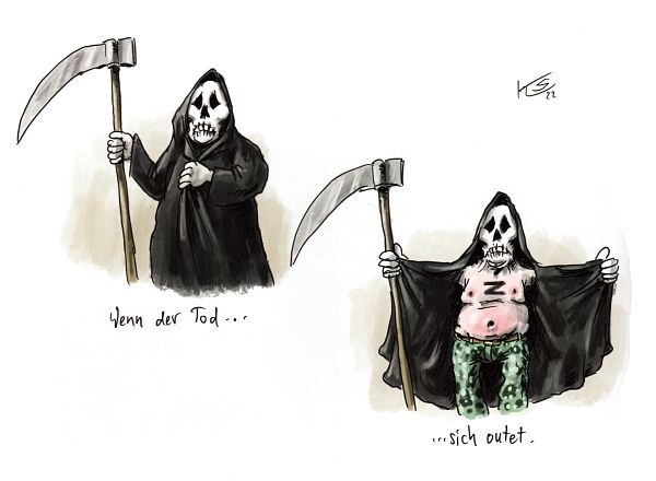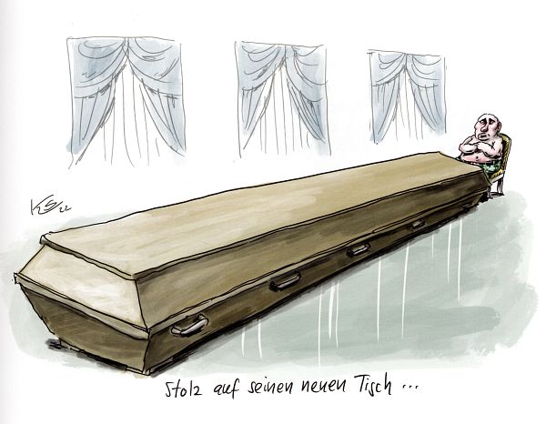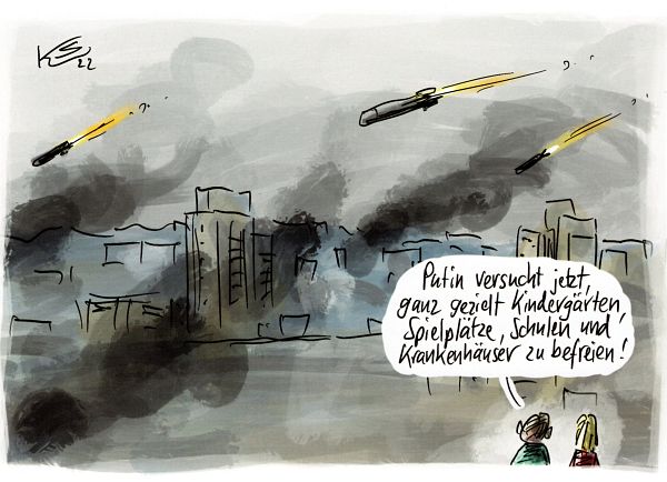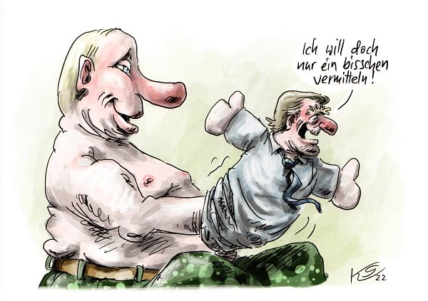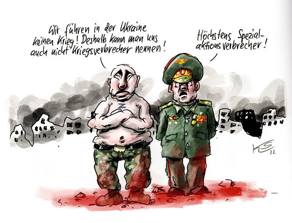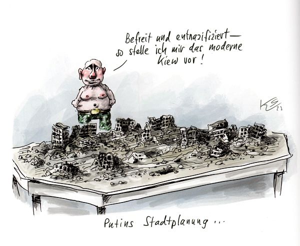Auch Klaus Stuttmann, einer der meistpublizierten Karikaturisten Deutschlands, hat zum Jahresende wie gewohnt beim Schaltzeit Verlag seine Jahresbilanz vorgelegt. Seine täglich in über 20 deutschen Tages- und Wochenzeitungen, Magazinen und Zeitschriften erscheinenden Karikaturen bringen für ein Millionenpublikum von u.a. Tagesspiegel, Leipziger Volkszeitung, taz und Financial Times Deutschland täglich die Weltereignisse auf den Punkt. Weil er sich 2022 besonders liebevoll um Russlands neuen Aushilfs-Stalin gekümmert hat, den Mann, der gerne mal halbnackt auftritt, um seine Männlichkeit unter Beweis zu stellen und deshalb auch in der Ukraine Schulen, Kindergärten, Krankenhäuser, Wohnblocks und jetzt im Winter Heizkraftwerke, Stromversorger, eben die bürgerliche Infrastruktur bombardieren läßt, haben wir beschlossen, ihm darin zu folgen. Auch daß der Kriegsverbrecher Putin in Deutschland zumindest zwei Freunde hat, wollen wir nicht verschweigen. Einen davon zeigen wir ebenfalls im Bild. Der andere weiß, daß er gemeint ist.