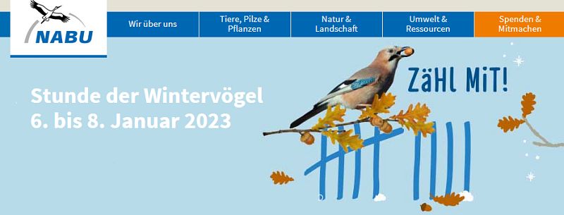 Die Beobachtungen können per App unter www.NABU.de/vogelwelt, unter www.stundederwintervoegel.de oder unter www.NABU.de/onlinemeldung bis zum 16. Januar gemeldet werden. Zudem ist für telefonische Meldungen am 7. und 8. Januar, jeweils von 10 bis 18 Uhr, die kostenlose Rufnummer 0800 1157-115 geschaltet. Die Naturschutzjugend lädt mit der „Schulstunde der Wintervögel“ vom 9. bis 13. Januar 2023 alle Kinder ein, die heimischen Wintervögel spielerisch kennenzulernen, zu beobachten und eine Stunde lang auf dem Schulhof, im Park oder im Garten zu zählen. Das Begleitheft zur Schulstunde liefert zahlreiche Anregungen. Ein Poster stellt die häufigsten Wintervogelarten vor und eine kindgerechte Zählkarte erleichtert die Teilnahme an der Vogelzählung.