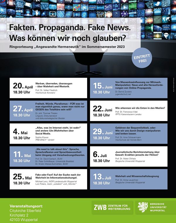 Alle kostenfreien Veranstaltungen beginnen um 18:30 Uhr jeweils donnerstags in der CityKirche Elberfeld, Kirchplatz 2. Alle Termine unter https://hermeneutik.uni-wuppertal.de/de/ringvorlesung-fakten/