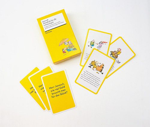 Der Reclam Verlag hat in Zusammenarbeit mit Tillmann Prüfer vom ZEITmagazin für das kommende Jahr 2024 einen klugen Monats-Kalender (21 x 29,5 cm) mit ausgewählten Geschichten sowie ein Karten-Set, ich nenne das ein Tarot mit Schmunzel-Effekt, mit einer Auswahl von 52 Fragen/Antworten zusammengestellt, die er aktuell im Spielkarten-Format zum beherzigenswerten täglichen Gebrauch vorlegt. Es ist eine humorvolle, altersweise und durchaus beherzigenswerte Melange aus Konfuzius und Radio Eriwan, platzsparend und sooo klug! Nehmen wir nur das hier: Herr Janosch, schwere Entscheidungen, wie trifft man die? – „Man schreibt die Alternativen tabellarisch auf einen Zettel. Anschließend legt man den Zettel nieder und wirft einen Löffel auf den Zettel. Dann geht man weg und läßt den Löffel das regeln. Sein Problem.“ Oder das: Herr Janosch, wie hält man das Glück fest? – „Es kommt auf das Glück an. Wondraks Glück ist ein kleiner Hund. Den muß er nicht festhalten. Eine Wurst genügt.“ (Janosch muß unseren Freund Erwin Grosche kennen.) Und wo das Paradies zu finden ist, erfahren wir auch. Andere Beispiele zeigt das Bild: