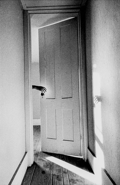 „Diese Geschichte ist ziemlich leicht zu erzählen. Ich hatte einen Freund, der Direktor eines Theaters war. Er und seine Schauspielertruppe mieteten einen alten Bauernhof in Pennsylvania und lebten dort in einer Gemeinschaft. Ich besuchte eine Freundin und wir gingen zu diesem Haus. In dieser Zeit hatte ich ein 28/35 Objektiv, ich hatte keine Beziehung zu dem 50er Objektiv. Aber egal, sie kam aus diesem Raum und ich stand in dem Hausflur und ich sah ihre Hand, die den Knauf faßte. Viele Leute denken, daß ich die Tür hinter ihrer Hand nachbelichtet habe. Aber es handelte sich um einen alten gläsernen Türknauf, der dieses Licht tatsächlich warf, das man auch an der Wand sehen kann. Ihre Handfläche erschien genau in diesem Licht. Und als das genauso war, sagte ich plötzlich „Stop“ und ich nahm dieses Bild auf und druckte es. Es hing lange in meinem Hotelzimmer im Chelsea. …