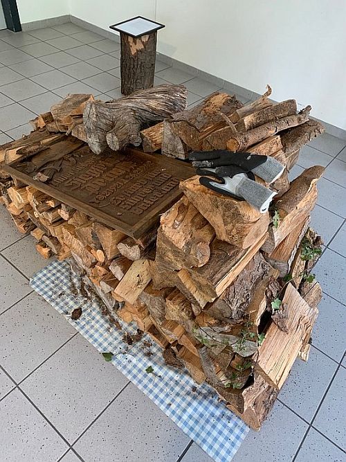 So beschäftigt sich ein Raum mit dem Thema Erinnerung. Zu sehen sind u.a. Portraits von Menschen, deren Gesichter verschwinden, eine Auseinandersetzung mit dem Thema Demenz. Parallel dazu liegt eine Gedenktafel, die an einen verstorbenen Soldaten des Zweiten Weltkrieges erinnert auf einem Stapel Brennholz. Ein ´Objet trouvé`, in die Universität transferiert, so, wie im Garten vorgefunden. „Das hat familiär gesehen natürlich eine sehr bestürzende Bedeutung“, sagt Pfeiffer, und gleichzeitig ist es ein Beispiel für weiterhin schwer zu bewältigende Erinnerungskultur.