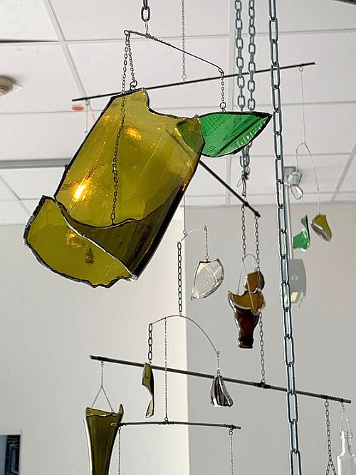 Die Ideen der Studierenden seien so vielfältig, wie die Menschen selber, sagt Pfeiffer und man könne zu jeder Arbeit eine lange Geschichte erzählen. „Z.B. haben wir eine Studentin, die wohnte neben einer Kirche. Sie hat schon als Kind immer diese Kirchenfenster und auch die Innenräume gesehen und wollte sich unbedingt mit dieser besonderen Raumwirkung beschäftigen.“ So entstand dann das Thema Kirchenfenster, mit dem man sich historisch, technisch oder zeitgenössisch auseinandersetzen könne, erklärt Pfeiffer. Das gehe dann über die klassischen Bleiverglasungen bis zu moderner Glaskunst der 2007 im Kölner Dom eingesetzten Südquerhausfenster nach dem Entwurf von Gerhard Richter, woraus dann Stück für Stück ein eigenes Thema entwickelt wird. Die Studentin Kim Schröter zeigt in der Ausstellung dazu nun eine Art Glasmobile mit changierenden Farben, sowie ein beleuchtetes möbelartiges Objekt mit selbst hergestellten Bleiglasscheiben.