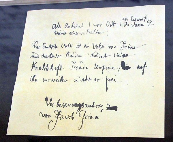 Jacob Grimm hatte sich im Laufe der Jahre in politischen und wissenschaftlichen Kreisen einen Namen gemacht. „Er hatte sich spätestens 1837 politisch so exponiert, daß er als ein liberaler Stern, wie man damals sagte, galt“, sagt Grothe. Mehr noch, manche sahen in ihm gar einen Märtyrer, der für seine Überzeugung sogar seine Entlassung in Kauf genommen hatte. „Als er 1848 dann in die Nationalversammlung gewählt wurde, rief eine Kölner Zeitung schließlich dazu auf, man solle doch Jacob Grimm wählen, denn der sei doch so ein berühmter Mann, ein so bedeutender Wissenschaftler, der auch schon für die deutsche Nation eingetreten sei. Und er wird kurioserweise dann in einem Wahlkreis in Mülheim an der Ruhr gewählt. Das war nicht vom Wohnort abhängig, denn er lebte damals in Berlin, aber so konnte er dann in die Frankfurter Paulskirche einziehen.“ Grimm legte in der Nationalversammlung einen Entwurf für den ersten Artikel der Grundrechte vor, der lautete: „Das deutsche Volk ist ein Volk von Freien und deutscher Boden duldet keine Knechtschaft. Fremde Unfreie, die auf ihm verweilen, macht er frei.“ Sein Verbesserungsvorschlag wurde jedoch mit knapper Mehrheit abgelehnt und er zog sich alsbald ins Privatleben zurück, zumal er damals ja bereits 63 Jahre alt war.