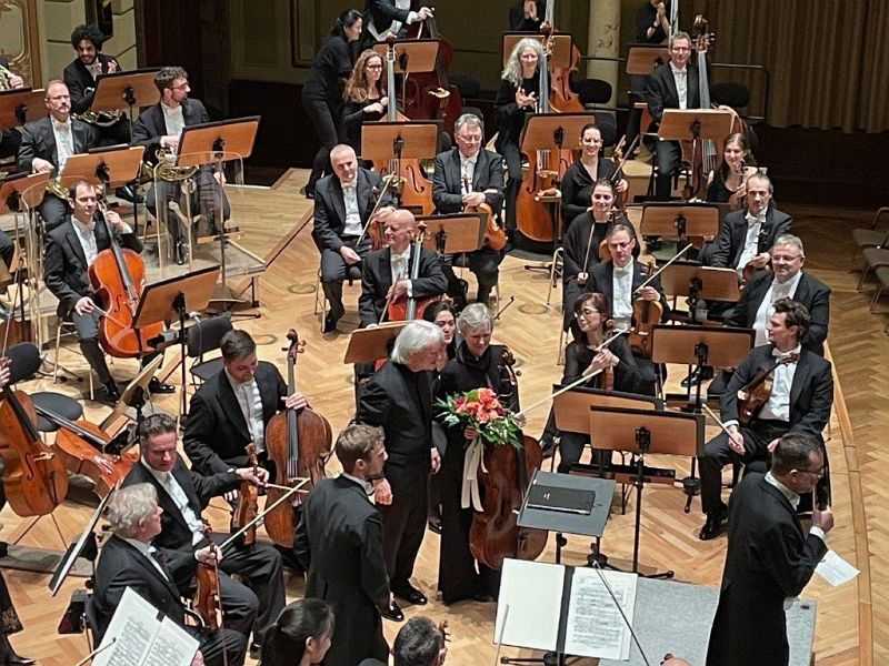 Des Helden Gefährtin“ ist der Abschnitt übertitelt, in dem sich die von Nikolai Mintchev beseelte Solovioline bzw. Ihr Klang im großen Saal ausbreitete. „…sehr weiblich, ein wenig pervers, ein wenig kokett“…. klangen diese Passagen auch am Ende des 19. Jahrhunderts und wenn es im Laufe der Tondichtung eine Schlacht gibt, dann vermutlich mit den Kritikern, nicht mit dieser Pauline. Bekannterweise zitiert Richard Strauß im Abschnitt seines „Friedenswerkes“ 30mal sich selbst aus früheren Werken. Muß man das alles wissen, um das Werk zu verstehen? Muß man es überhaupt verstehen? Es reicht, wenn die Musik uns ergreift. Das tat sie mit glanzvollem Blech (zwei Tuben!), seidigen Streichern und virtuosen Holzbläsern. Der Hörer wird allerdings kaum ein Thema erkennen. Satirisch ironisch wie klanggewaltig ging das Werk zu Ende, vierzigminütiger orchestraler Hochgenuß. Das Publikum bejubelt die grandiose Aufführung mit Bravi und Pfiffen. Zuletzt bahnte sich der Dirigent seinen Weg durch das Orchester zu Christine Altmann, umarmte sie, bat sie an sein Pult. Die Verdienste der Cellistin wurden von ihren Kollegen gewürdigt und sie wurde nach 30 Jahren in den Ruhestand entlassen. Gerne erinnern wir uns an die Cello-Delikatessen.