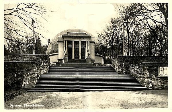 Zwar stand das erste optische Planeatrium bereits in München, das erste Großplanetarium wurde jedoch in Barmen gebaut. „Die Kuppel in München ist wesentlich kleiner, hat einen Durchmesser von ungefähr 15 Metern und war kein eigenständiger Bau, sondern ins Museumsgebäude integriert“, berichtet Engert. Der Projektionsapparat sei noch das Modell I gewesen. Das Barmer Planetarium hingegen war ein freistehender Bau, hatte eine Kuppel von ca. 25 Metern Durchmesser und schon das Projektionsmodell II. „Deshalb kann man zurecht vom ersten Großplanetarium der Welt in Barmen sprechen.“ Schon die Außenansicht ließ die Besucher staunen. Dazu Engert: „Zunächst gelangte man über zwölf Meter breite Treppen zum Kuppelbau, der links und rechts mit Mars- und Venusstatuen, den Gottheiten aus der Mythologie, als Verbindung zur Sternenwelt geschmückt war. Die Kuppel selbst war 15 Meter hoch. Vor der Kuppel gab es eine 11 Meter x 4 Meter große Vorhalle, wo sich die Kassen befanden. Im Planetarium selber konnten ca. 600 Menschen Platz finden. Zum Vergleich: in Bochum gibt es heute ca. 250 Plätze. Die Kosten für diesen Bau lagen damals bei 350.000 Reichsmark.“
