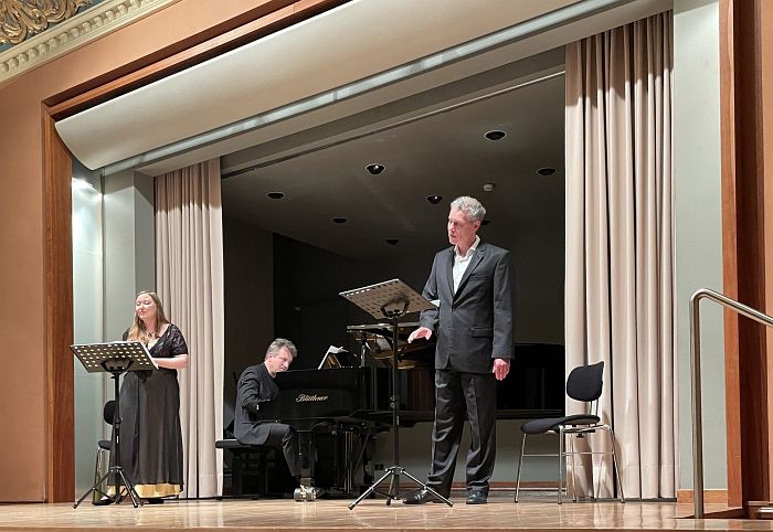 Und um es gleich vorab zu sagen: mit Dorothee Mields (Sopran), Thomas Laske (Bariton) und Tobias Koch (Klavier) gab es wieder einen Liederabend der Spitzenklasse in Wuppertal. Nur zu Beginn hakte es ein bißchen bei der Anpassung der großen Stimmen an den kammermusikalischen Saal. Aber bald glänzten Sängerin und Sänger mit differenziertester Dynamik und seelenvollen Stimmen, wenn sie sich schauspielerisch-gestisch einander zusangen. Daß Hugo Wolf ein glühender Wagnerverehrer war, merkt man dem leichten, nahezu schwebenden Klaviersatz nicht an. Tobias Koch begleitete spielerisch elegant diese spätromantischen, eher im Parlando daherkommenden Liedsätze, die ohne schräge, auf drohende Atonaltät hinweisende Disharmonien auskamen. Nie zu laut perlte reiner Wohlklang aus dem halb geöffneten Blüthner-Flügel. Ein Schildbürgerstreich, würde dieser für intimere Kammermusik bestens geeignete Flügel verscherbelt. Über Hugo Wolfs musikalischen „Humor“ wäre einmal gesondert nachzudenken. Immer wieder schmunzelte das Publikum und freute sich an den Sarkasmen der Verliebtheit, z.B. wenn die Sängerin ihren kleinen 14jährigen Geliebten besingt und mit den Augen in der hinteren oberen linken Ecke des Saals ihre Muse sucht. Ihr scheint auch der „schöne Toni“ attraktiv, der auf einem Backenzahn mit Wurst und sieben Broten seine Verdauung stählt. Ernst wird es, wenn sie über die Armut des Geliebten singt, der in seinem kargen Zimmer kein Fäßchen Wein zum Liebesmahl bietet. Wenn der Sänger dann elegisch bittet, „ihm kein Grab zu graben, seine Glieder… in Regen und Wind niederzulegen“ und das Klavier mit ruhig punktiertem Orgelpunkt in der Tiefe pocht, dann scheint sich das Schicksal des Komponisten anzukündigen, der Wahn und Sinn, also beide Aspekte seiner Existenz verkörpert hat. Nachdem er sich im Wahn für den Hofoperndirektor hielt, legte man ihn rein, riet ihm, sich dort vorstellen, brachte den so Getäuschten aber in die Psychiatrie, wo er wegen einer Neurolues bis zu seinem Tode vier Jahre lang mit zunehmender Demenz, Wahnvorstellungen, Persönlichkeitsstörungen blieb. Die Syphilis hatte er sich mit 18 Jahren eingefangen. Beim Ausbruch der Sängerin „Schweig einmal still, du unseliger Schwätzer dort“ gefriert die Seele, erst recht wenn sie den Sinn ihres Lebens im letzten Lied mit Verve besingt und über alle ihre Liebhaber berichtet, allein „vier in La Fratta und zehn in Campione“ bejubelt. Das Publikum im voll besetzten Mahler-Saal dankte mit frenetischem Applaus, Pfiffen, Bravi. Ja, nicht nur die Wucht und Größe Brucknerscher oder Brahmsscher Sinfonien kennzeichnen die phantastische Romantik des 19. Jahrhunderts. Die liebte eher die kleine Form des Liedes mit und ohne Worte. So beschlossen die drei als Duett mit Klavier den großen Liederabend sehr passend mit dem Nachtgesang „Licht und Liebe“, von Franz Schubert.