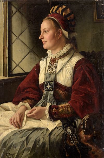 Elisabeth Baumann, später Jerichau-Baumann (1819-1881), studierte ab 1838 in Düsseldorf. Sie wurde zur bekanntesten Künstlerin mit Düsseldorfer Ausbildung und zu einer der bekanntesten europäischen Künstlerinnen des 19. Jahrhunderts überhaupt. 1845 ging sie nach Rom, nach der dortigen Heirat mit dem Bildhauer Jens Adolf Jerichau dann in dessen Heimatland Dänemark. Während sie dort mittlerweile wieder bekannt ist, kennen nur wenige Deutsche die Malerin, die von dem Künstler Peter von Cornelius „der einzige Mann der Düsseldorfer Schule“ genannt wurde. Sie machte sich unter anderem mit Szenen aus dem italienischen Volksleben einen Namen, war aber auch mit Porträts sehr erfolgreich. Ihr Bildnis der Brüder Grimm zierte später den 1000-Mark-Schein.