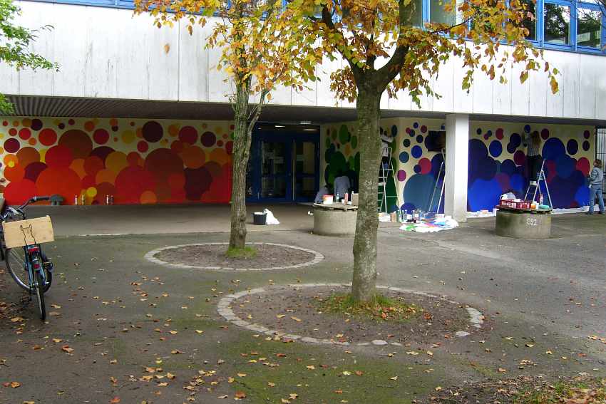 Elke Wolny erzählt: „Das Ganze hatte eine Vorgeschichte. Vor zwei Jahren hatte meine damalige Kunstklasse (Kunstprofil, 13. Jahrgang) die Idee, diese drei Wände, die fast 50 Jahre lang ein graues Dasein gefristet hatten, zu bemalen. Ich wußte ja, wie viel Arbeit das ist. Die Schüler legten einen großartigen Entwurf vor und los ging es. Wir hatten zum Glück noch zwei Stunden des sogenannten 'Seminarfachs' dafür, trotzdem arbeitete ich noch mit einigen Schülerinnen und Schülern die halben Herbstferien durch.