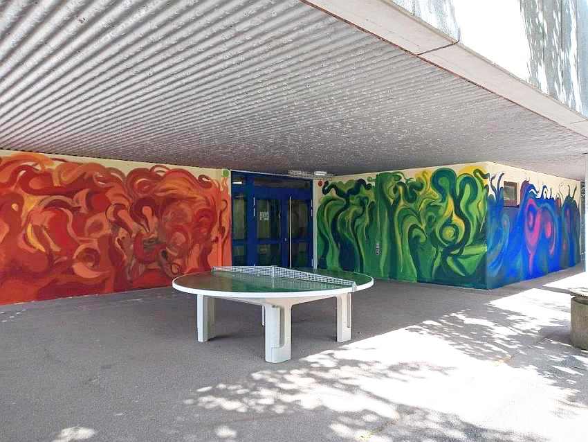 Die Wände sahen großartig aus, zumindest ein halbes Jahr, bis sie in den vergangenen Osterferien von Narrenhänden mit Graffiti beschmiert wurden. Jemand der sich zuständig fühlte und der meinte Ahnung zu haben, entschied, daß das Ganze nicht zu retten sei und ließ alle drei Wände einfarbig übermalen.