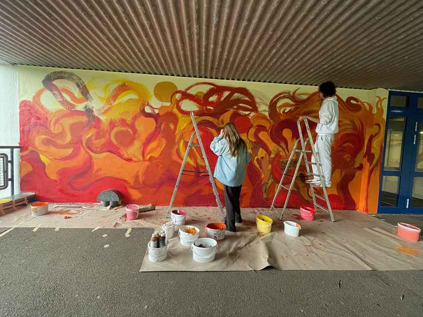 Flensburg/Red. Jesse, Leonie und Max, drei Schüler der 13. Klasse der Flensburger Kurt-Tucholsky-Schule gestalteten nach dem offiziellen Ende ihrer Schulzeit unter der Anleitung ihrer nun auch aus dem Amt scheidenden Kunstlehrerin Elke Wolny als Geschenk an ihre Schule drei Wände am sogenannten Südeingang neu.