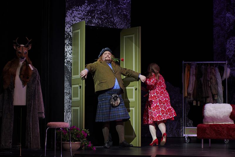 „Die Lustigen Weiber von Windsor“  als Saisonschluß in der Oper Wuppertal Krieg, Hunger, Klimakatastrophe, Nationalismus überall, da scheint die Oper mit dem Titel „Apokalypse“, jetzt in Nürnberg uraufgeführt, passender. „Dennoch unverzagt“ ging in Wuppertal die Spielzeit anders zu Ende. Bei „Die „Lustigen Weiber von Windsor“ handelt es sich um die heiterste und populärste Oper der deutschen Opernliteratur. Falstaff wollen alle Frauen, glaubt er. Beim Wetttrinken gewinnt er gegen alle. Schließlich trainierte er dafür bekanntlich „schon als Büblein klein an der Mutterbrust“. Aus Otto Nicolai (1810-1849) wollte sein ehrgeiziger Vater ein Wunderkind machen. Das Trietzen konnte er nicht ertragen. So floh er mit 16 Jahren aus dem Elternhaus. In Berlin wurde er von Carl Friedrich Zelter unterstützt, und studierte Kirchenmusik. Bei der Wiederentdeckung der Matthäuspassion 1830 sang er den Jesus und ging als Organist an die Kapelle der preußischen Gesandtschaft im Vatikan. Fasziniert von der italienischen Oper, hatte er als Komponist in Italien durchaus Erfolg, bevor er als Erster Kapellmeister an die Hofoper in Wien berufen wurde, wo er mit dem Opernorchester am 28.März 1842 ein großen Konzert veranstaltet hat, welches als Gründung der Wiener Philharmoniker gilt. Nach seinem Wechsel an die Berliner Staatsoper wurde dort 1849 unter seinem Dirigat „Die Lustigen Weiber“ uraufgeführt und 2 Monate später starb er am Schlaganfall. Das Libretto stammt vom Komponisten selbst und von Hermann Salomon Mosenthal (1821-77).  Schon während der Ouvertüre kam das Opernpersonal gestikulierend von rechts und links auf die Bühne, prügelte sich schon mal ein bißchen; ein Polizist rannte dazu. Musikalisch beginnt das Ganze mit einem hohen Streicherorgelpunkt, unter dem ein ernstes Cellothema gemächlich auf- und absteigt. Bei zunehmendem Tempo kündigen sich die Verwicklungen schon musikalisch an.  Die Pelzhändlerinnen Frau Reich (Viola Zimmermann) und Frau Fluth (Margaux de Valensart) mußten empört feststellen den gleichen Liebesbrief von Falstaff (Erik Rousi) erhalten zu haben. Bei anfänglich verhaltener Stimmenzartheit ihres Duetts setzten sie sie sich aber später im Verlauf auch im Ensemble problemlos durch. Sangmin Jeon als Fenton behauptete sogleich mit Schmelz, Innigkeit und großer Stimme an Lieb und Treue reich zu sein. Auf seine Anne machten sich aber auch Junker Spärlich (Yu Hyeok Lee) und Dr. Cajus (Yancheng Chen) Hoffnung. Schon im 1. Bild wird das Konzept des nachhaltigen Bühnenbildes deutlich, mit dessen Kernelementen, schnell verschoben und gedreht, das Bühnenbild für alle Szenen leicht verändert werden kann. Dieses modulare Bühnenbild dient einer nachhaltigen Musiktheaterproduktion, wozu sich die Oper Wuppertal verpflichtet hat. Im 2. Bild (Zimmer der Damen) hofft der fette Sir John auf die Gunst der „Lieblichste der Tauben“, („Du sollst meine Lady sein“), die sich zum Schein auf in einläßt, als die Kumpanin Reich den eifersüchtigen Ehemann ankündigt und Sir John sich im Wäschekorb verstecken muß. Die Damen lachen und das Orchester mit kurzem Staccato der Holzbläser gleich mit. Der getäuschte Ehemann findet keinen Nebenbuhler und der Dicke landet mit dem Wäschekorb in der Themse.
