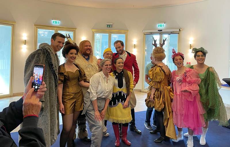 Im 2. Akt kommen die Jäger aus dem Foyer durch den Zuschauerraum in ein Wirtshaus mit sehr langer Theke. Sir John trinkt alle unter den Tisch und bekennt, daß er schon als „Büblein klein an der Mutterbrust…“ keinen Trank verschmäht hat. In der nächsten Szene im Garten mit Gefühlsnebel über der Bühne bringt Fenton seiner Anna das berühmte Ständchen „Horch die Lerche singt im Hain ...“, wozu die trillernde Querflöte den Vogel gibt und die Harfe die Stimmung. Das Duettino von Fenton und Anna mit dem großen Violinsolo wurde innig und zu Herzen gehend von allen dreien vorgetragen, ein musikalischer Höhepunkt unter dem einfühlsamen wie sicheren Dirigat von Immanuel Karle an diesem Abend. Es bleibt festzustellen, daß alle Sängerinnen und Sänger mit großem Ausdruck, blitzsauberer Akkuratesse und wunderbarer Intonation auch in den zahlreichen Ensemble- und Chornummern reines Opernvergnügen geboten haben, ganz abgesehen von lebhafter und lebendiger Bühnenpräsenz. Der fulminante Ehestreit zwischen Frau Fluth und ihrem eifersüchtigen Ehemanne war musikalisch wie spielerisch das reine Vergnügen. Anna (Natalia Labourdelle) setzt zuletzt sich gegen die Eltern durch, verkuppelt beide von Eltern ausgesuchte Ehepartner miteinander, heiratet heimlich ihren Fenton und besingt mit großer, bis in höchste Höhen mit eleganter differenzierter Stimme musikalisch bewegend ihre Träume. Im letzten Bild (holde Nacht dunkler Wald goldene Sterne am Himmel) wird musikalisch Bezug genommen auf die Ouvertüre. Endlich drangsalieren und peinigen die Elfen mit weißen Ballons in der nächtlichen Waldszene musikalisch souverän wie theatralisch einfallsreich als Mücken-Fliegen-Wespenchor den genasführten Falstaff. Das Leben ist gottseidank ein Theaterspiel und in der Oper gibt es ein Happy End.  Nicolai, der die italienische Oper über alles liebte, wird im Programmheft zitiert, „der Italiener geht ins Theater, um sich zu vergnügen“. Das taten die Wuppertaler an diesem glänzenden Abend auch. Wie Frauen mit Männern oder Männer mit Frauen umgehen, fasziniert zeitlos. Eifersucht, Anmache, Zicken und natürlich Liebe waren für Shakespeare vor 500 Jahren schon das Thema, welches mit den „Lustigen Weibern“ und ein halbes Jahrhundert später mit Verdis „Falstaff“ zu Höhepunkten in der Geschichte Oper wird. Wie selbstbewußt Anna, die Tochter des Pelzhändlers, hier 1849 ihr Leben selbst bestimmt, überrascht. Emanzipation gab es also schon vor und unabhängig von der Frauenbewegung. Langen und großen Applaus mit Bravi und begeisterten Pfiffen gab es am Ende für diese spielfreudige, lebendige, unterhaltsame Inszenierung, die den musikalischen Witz und die Poesie dieser romantischen Oper von erstaunlicher Länge (knapp drei Stunden) unterhaltsam auf die prächtige Bühne gebracht hat.  Beim Hinausgehen stand das Sängerensemble in Kostümen mit der Intendantin im Foyer, um sich für die Sommerpause zu verabschieden.