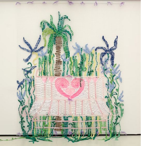 Delphine Dénéréaz draws from her recent exhibition Bienvenue à Delfunland, presented at the Collection Lambert in 2023. The architectural structures of this imaginary city will intertwine with the flowered and deconstructed chapel of Un lieu à soi, reinventing a “village square” at the very heart of the fair. From the fountain to the hotel, each element seems to resonate, inviting visitors to gather and interact.To breathe life into these elements, Delphine Dénéréaz resurrects forgotten textiles that were destined for abandonment, reflecting her concern for environmental issues. She revisits the artisanal technique of the “lirette rug” (“tapis de lirette”), modernizing it with a contemporary sensibility to explore concepts of identity and belonging. "I have always been interested in testimonies, whether through material or motifs, but those with no value other than sentimental – charms, talismans, comfort objects. Rugs have always conveyed through their patterns the daily life stories of those who weave them. By repurposing domestic objects, beyond what I see as an essential responsible approach today, I attribute value to what appears to have none: poor materials destined for the bin, trivial everyday textiles that carry the weight of our most intimate emotions. I play with the encounter between a traditional technique and contemporary symbols, bearing witness to a generation. The result is pieces inspired by my daily life, our society steeped in images, saturated with collective symbols, which everyone appropriates in the quest for their own identity through integration into the group, bolstered by logos, signs, and symbols." – Delphine Dénéréaz