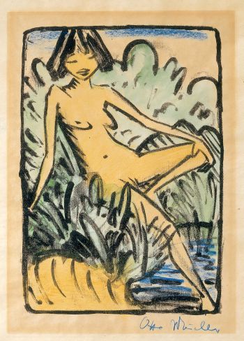 „Natürlich nackt“, wie die Kunsthalle Emden im Jahr 2016 ihre Sommerschau zum Werk Otto Muellers nannte, implizierte zwei Sinngehalte zugleich - zum einen verweist es darauf, daß Akte unabdingbar zum Sujet des Brücke-Künstlers Otto Mueller gehören und zum anderen spielt es auf die Natur als wesentlichen Bildgegenstand des Künstlers an. Die Kunsthalle Emden besitzt neben dem prominenten Gemälde „Knabe vor zwei stehenden und einem sitzenden Mädchen (1918/19) noch sechs wertvolle Papierarbeiten von Otto Mueller. Der am 16. Oktober 1874, heute vor 150 Jahren im schlesischen Liebau (Lubawka, Polen) als Sohn eines Steuerbeamten und ehemaligen Offiziers geborene Otto Mueller lernte Lithograph und studierte einige Jahre in Dresden und eine kurze Zeit in München. Erst unter dem Einfluß der Brücke-Künstler, die er 1910 in Berlin kennenlernte, fand er zu seinem expressiven Stil, der sich aber im Gegensatz zu seinen Künstlerkollegen durch einen gewissen Anflug von Lyrismus auszeichnet. Auch Mueller verfolgte das künstlerische Ziel einer Abkehr vom herkömmlichen Stil der Akademien und das Finden neuer künstlerischer Ausdrucksmöglichkeiten. Doch nimmt er in der Künstlergemeinschaft Brücke, deren Mitglied er wurde, eine Sonderstellung ein: Er ist merklich älter – zehn Jahre gegenüber Karl Schmidt-Rottluff und sechs Jahre gegenüber Ernst Ludwig Kirchner – und er ist „still, sanft, versonnen und gilt als Träumer und Romantiker, der die Ruhe und Harmonie sucht und den das Laute, Aggressive und Ekstatische eher schreckte“. Weltliche, urbane oder gesellschaftskritische Themen waren für ihn uninteressant, er suchte in „seiner Kunst zeitlebens den paradiesischen Urzustand des Menschen im Einklang mit der Natur“.