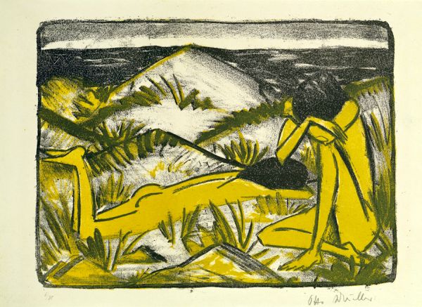 Akte in der Natur, die den Menschen unverfälscht darstellen sollen, begannen in diesen Brücke-Jahren zentrales Darstellungsthema zu werden. Während der Aufenthalte an den Moritzburger Seen und an der Ostsee, zusammen mit Erich Heckel und Kirchner, malte Mueller viele Variationen dieses Themas. In seiner Farbpalette herrschen Grün-, Gelb- und Ockertöne vor. „Er brachte uns die Leimfarben“, schreibt Ernst Ludwig Kirchner in der Chronik der „Brücke“ 1913. Diese Leimfarben auf ungrundiertem Rupfen (grober Sackleinen) sind sehr fragil und treiben Konservatoren den Angstschweiß auf die Stirn. Betrachtet man die Gemälde von Nahem, wird die brüchige Struktur des Farbauftrags deutlich. In den Aquarellen und den mehrfarbigen Lithografien wird die sichere Linienführung der Körper deutlich, so in „Mädchen im Dünengras“ (1925). Charakteristisch ist, daß die Körper oftmals kaum das Geschlecht erkennen lassen. Die jungen Mädchen im Gemälde „Zwei badende Mädchen“ (1921) in ihrer kantigen, schmalen und eckigen Körperlichkeit sind völlig unsexy, nicht einmal erotisch zu nennen, so ist es bei fast allen Akt-Darstellungen. Bei Otto Mueller steht stets die angestrebte Einheit von Mensch und Natur im Vordergrund. Gesichter und Köpfe geraten ihm deshalb öfters zu Stereotypen, ähnlich der Körperhaltungen beim Liegen, Sitzen und Stehen. Aber gerade deshalb wird nachvollziehbar, daß es, wie Mueller es zusammenfaßte, das „Hauptziel meines Strebens ist, mit größtmöglicher Einfachheit die Einheit von Landschaft und Mensch auszudrücken“.