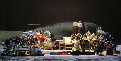 antwortet. So beginnt Elisabeth Stöpplers Britteninszenierung am Musiktheater im Revier, keine niedlichen, pittoresken Küstenhäuschen, nur viele Gebrauchsmöbel werden schnell vom Chor aufgebaut und stellen ein ganzes Dorf dar, ein an Sand erinnernder ansteigender, stufiger Boden, ebenso eine Art Segel auf der Bühne, Projektionen (hervorragend passend von Andreas J.Etter) zu den Zwischenspielen und der Sturmszene unterstützen die Musik und Aktion und bringen das Meereselement auf die Bühne. Kinder, die bleich und tot im Wasser treiben oder auch mit dem feuchten Element leben und spielen, dabei umkreist sich lauernd die Bevölkerung, jeder agiert hier schuldig und unschuldig, denn er könnte der nächste Außenseiter sein, so nehmen die Opfer des Stückes, Peter Grimes und sein Lehrjunge, zwischen unseren Reihen Platz. Noch beeindruckender als Barrie Koskys ähnliche Hannoversche Inszenierung aus dem letzten Jahr gelingt Stöppler ohne Sentimentalität, mit Kathrin Susann Broses schlichter Ausstattung, drei Stunden spannendes Musiktheater auf die Bretter zu bringen, im dritten Akt mit dem Bühnenorchester spürt man die Nähe zu Bergs "Wozzeck". Die Neue Philharmonie Westfalen wird von Rasmus Baumann aber auch durch die Partitur gepeitscht, nicht die Ruhepunkte des Werkes vernachlässigend, wird ein herber, eher aufgerauhter Britten geboten, die wirklich schon in ihrem Einsatz und ihrer Spielfreude und Klangfülle genial zu nennenden Opern-und Extrachöre unter Christian Jeub haben ihren Anteil daran. Alles was Brittens erste große Oper ausmacht, die Angst des Individuums vor den Anderen, der Natur und dem Tod wird fühlbar.